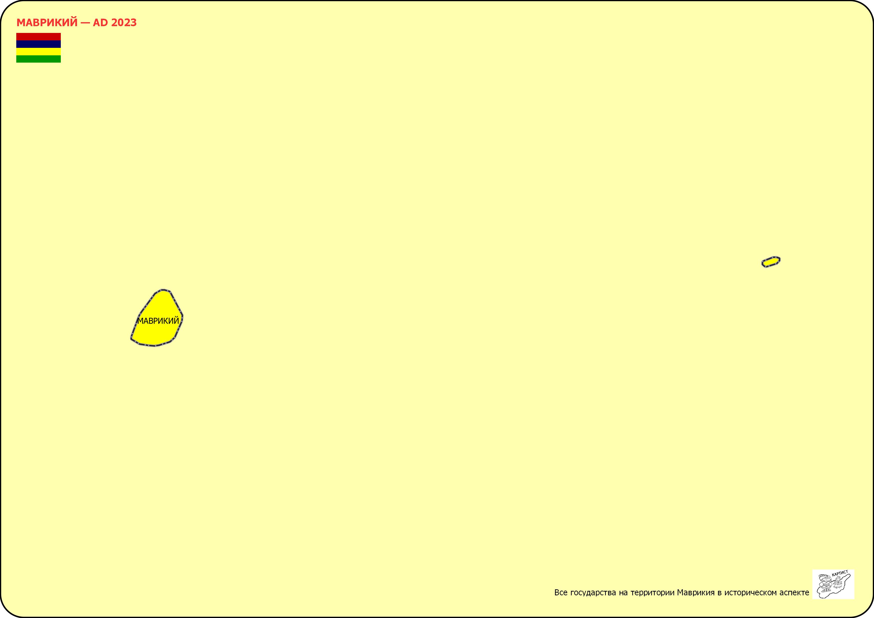 МАВРИКИЙ (AD 1968–) Государство, капиталистическое, республика (Республика Маврикий). Образовалось на терр. совр. Маврикия в результате провозглашения в Маврикии (брит.) независимости от Великобритании. Столица — Порт-Луи