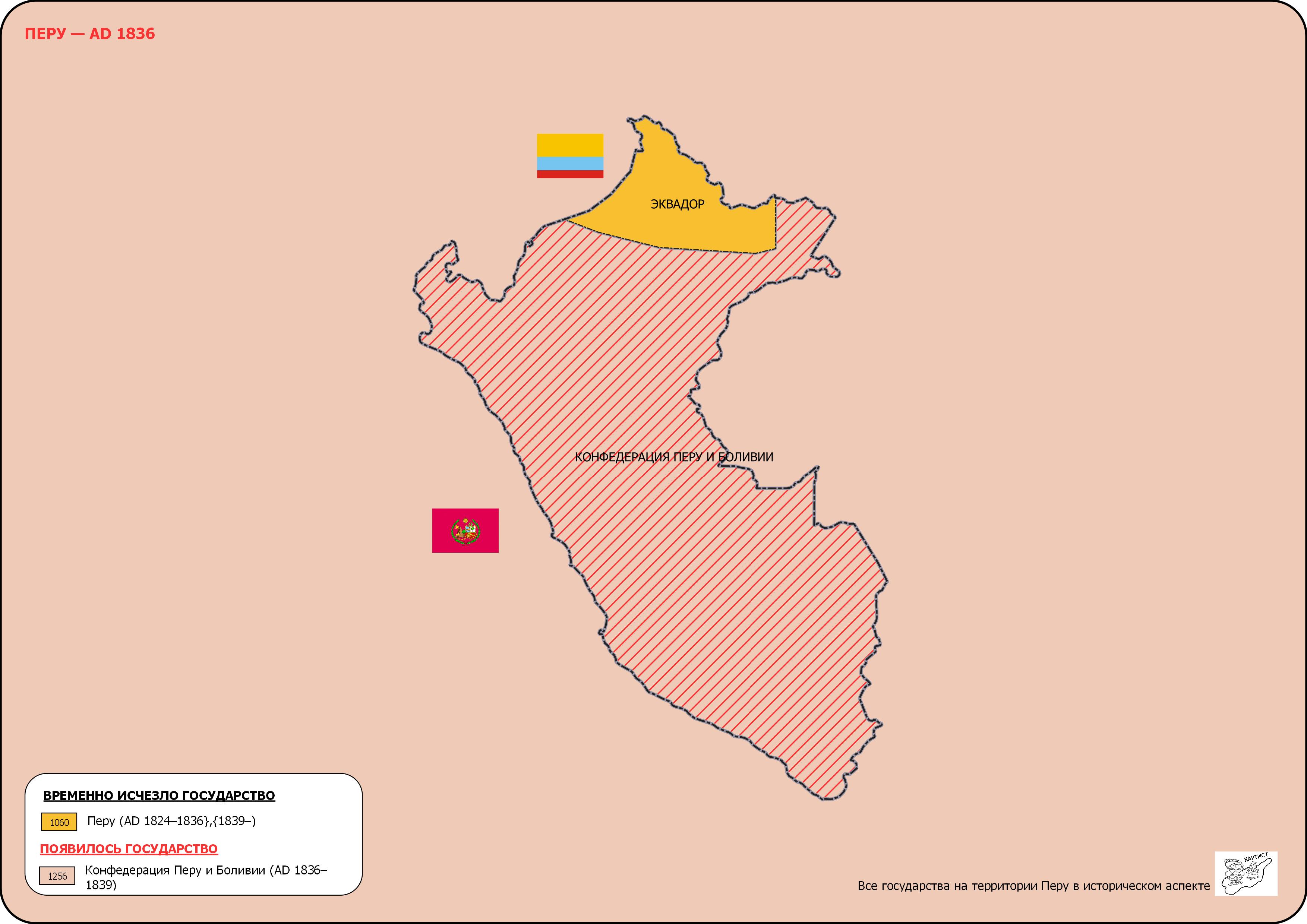 ПЕРУ (AD 1824–1836},{1839–) Государство, капиталлистическое, республика (Республика Перу). (Зародилось на на терр. совр. Перу в результате поражения Испании в Войне за независимость и провозглашения независимости в Перу (исп.)},{Вошло в ссотав Конфедерации Перу и Боливии. Вышло из состава Конфедерации Перу и Боливии). Столица — Лима